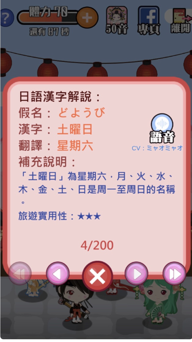 答題之後,系統還會告訴玩家該日語漢字的意思與解說,讓玩家以輕鬆有趣的方式,沒有壓力地學習日語。如果你正在學日語,或是想測試看看自己的日語能力,不妨來挑戰看看吧!