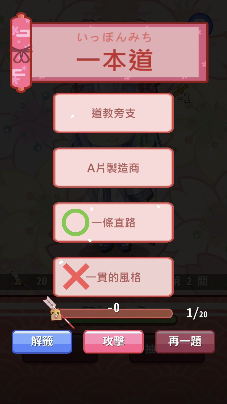 籤越吉利,代表題目越簡單。答錯或答對,都可以按一下左下角的「解籤」來了解日語漢字的意思。