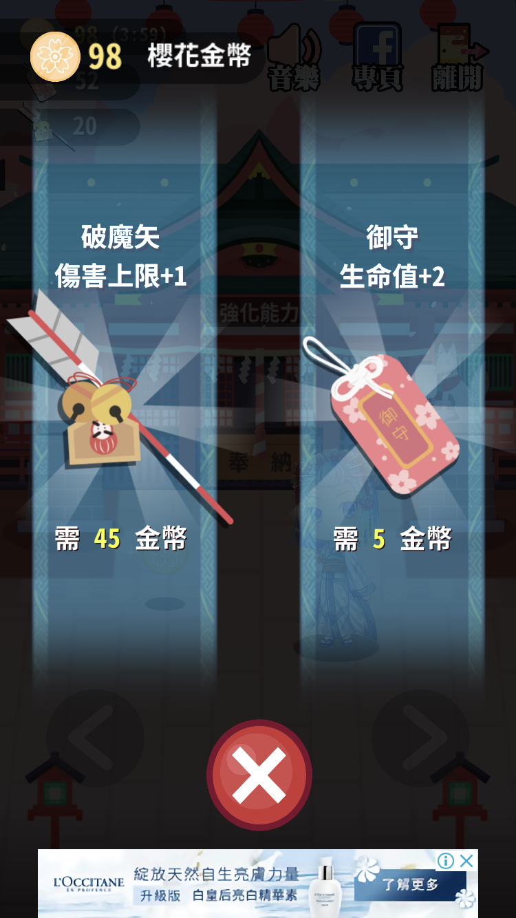 櫻花幣可以用來購買道具,破魔矢與御守都有著不同的功用,可以用來提升攻擊力與保護玩家的生命值。