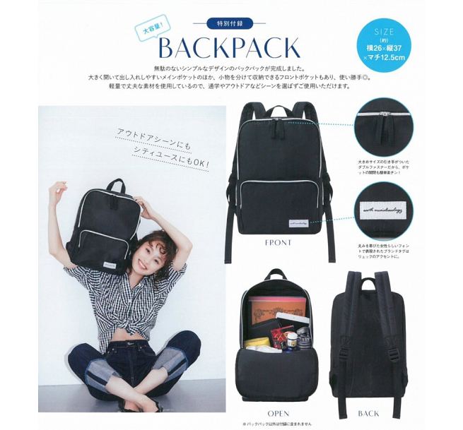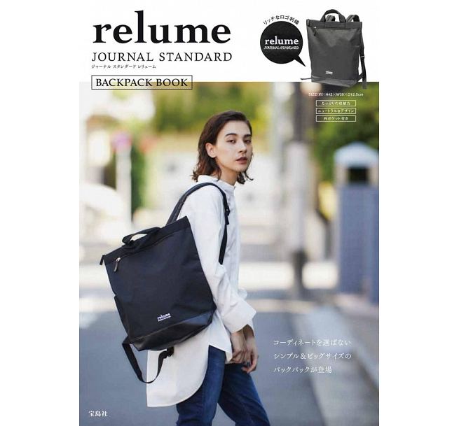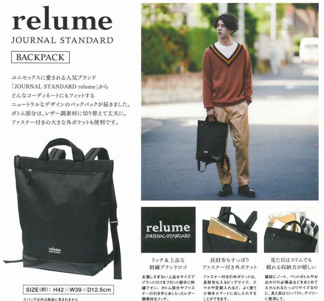 本期「JOURNAL STANDARD relume」時尚單品特刊,將隨刊附贈同品牌後背包,全黑的設計加上簡約的白色刺繡Logo,不管男女都可以使用!重點是,超大容量的設計,讓你不僅放得下A4文件,就連筆電也放得下,不管是外出郊遊或上班上課都非常適合喔!