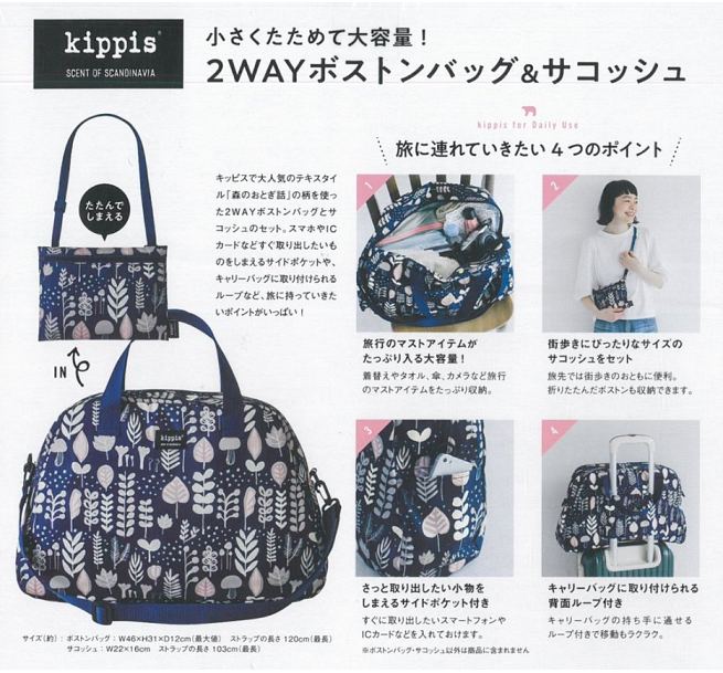 來自北歐的超人氣品牌kippis,推出一包兩用的獨家設計旅行提袋,全展開後呈波士頓包造型,可手提也能肩背,還可掛在行李箱拉桿方便拖行;摺疊後呈斜背小包造型,印花圖案採用的是品牌非常受歡迎的「森林童話」,包包兩側附置物口袋,可放手機、票卡等,臨時要拿取的隨身物品,大容量收納空間,裝放兩天一夜旅行行頭都不是問題。