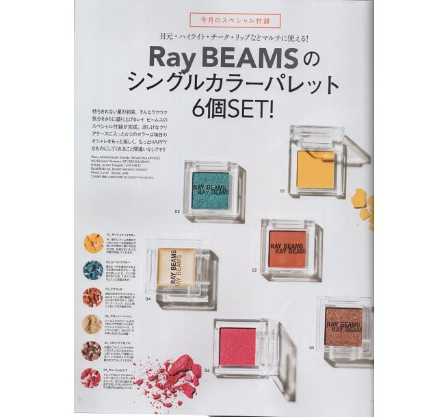本次的特別附錄是與流行品牌「RayBEAMS」合作的六色眼唇彩妝盤,不僅可以提亮眼睛的時尚魅惑感,夏季色系的唇彩也相當的實用好看,不管是經典色彩或夏季的潮流色彩一應俱全,讓您可以活用各色彩妝點在眼睛與唇部打造夏季的時髦彩妝。