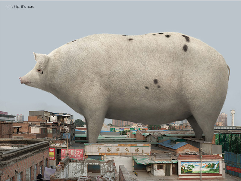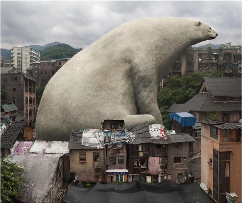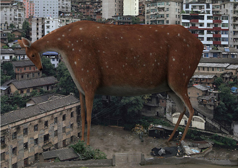 很快能發現這些圖像中,皆以龐大的動物做為主角,與背景渺小的城市形成強烈對比,動物們看起來突兀無助,因為牠們無法藏身在建築中、巷弄間,於是在破舊的城市裡顯得巨大。
