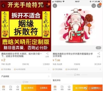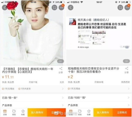 因此,搶著賺錢的賣家還將歪腦筋動到這上頭,銷售起「鹿晗關曉彤戀愛險、分手符」這類的商品,祈求兩人在一年之內分手,若一年期限到沒分,則可憑單理賠,賣家還說「1年未分手最高賠10倍」。(太狂了啦!)