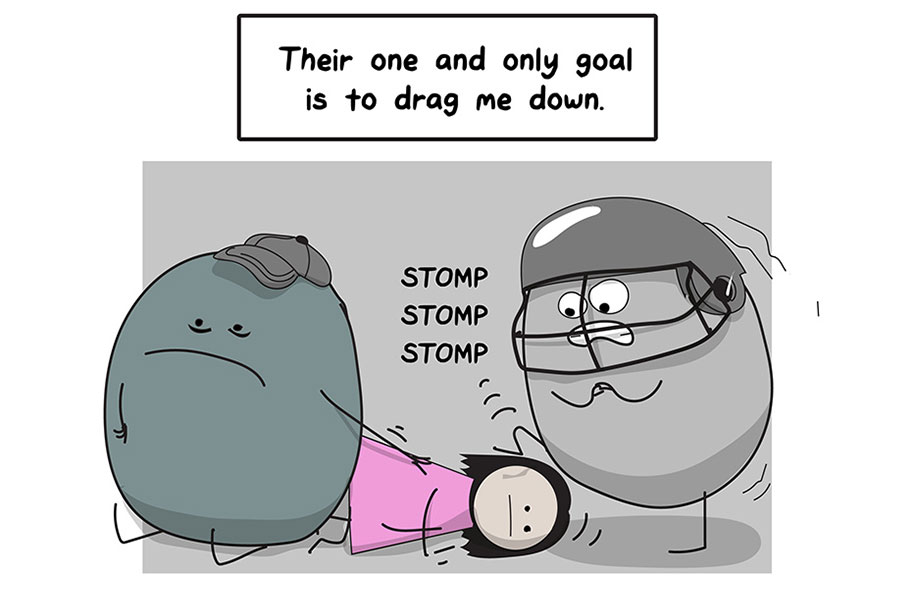 也許看完這系列漫畫你可以更理解,憂鬱症患者像是時刻活在被無形的巨大壓力擠壓的狀態裡,那種壓力不同於和情人吵架或被上司責罵那種過一兩天就可以恢復的負面心情。而是不斷糾纏著他們的內心,令他們夜夜難眠的一種慢性傷害。當你得知身邊有朋友為此所苦,請用更體貼溫柔的方式陪伴在他們身邊,過度的鼓勵或誇張的讚美其實只會令他們壓力值倍增啊!
