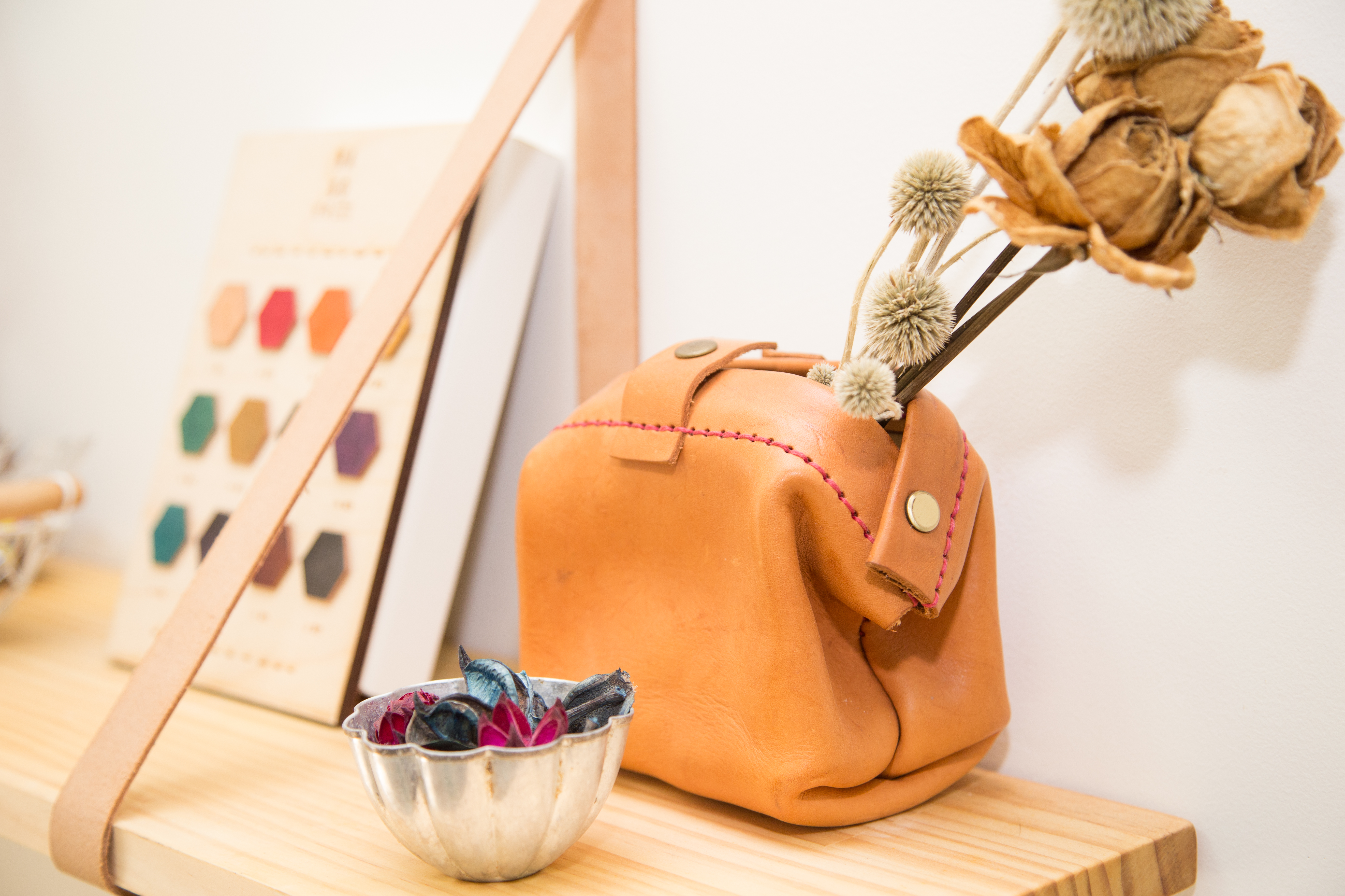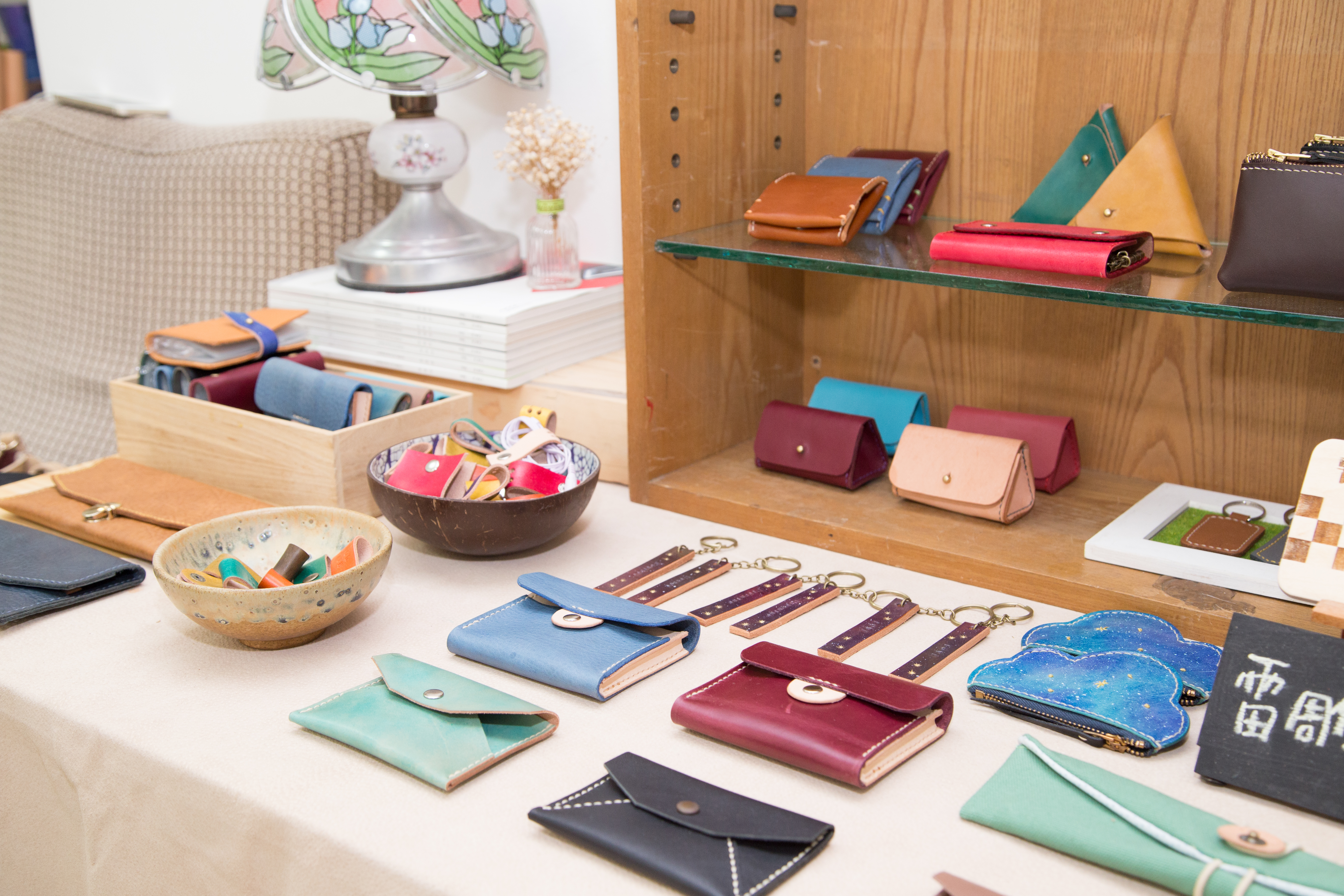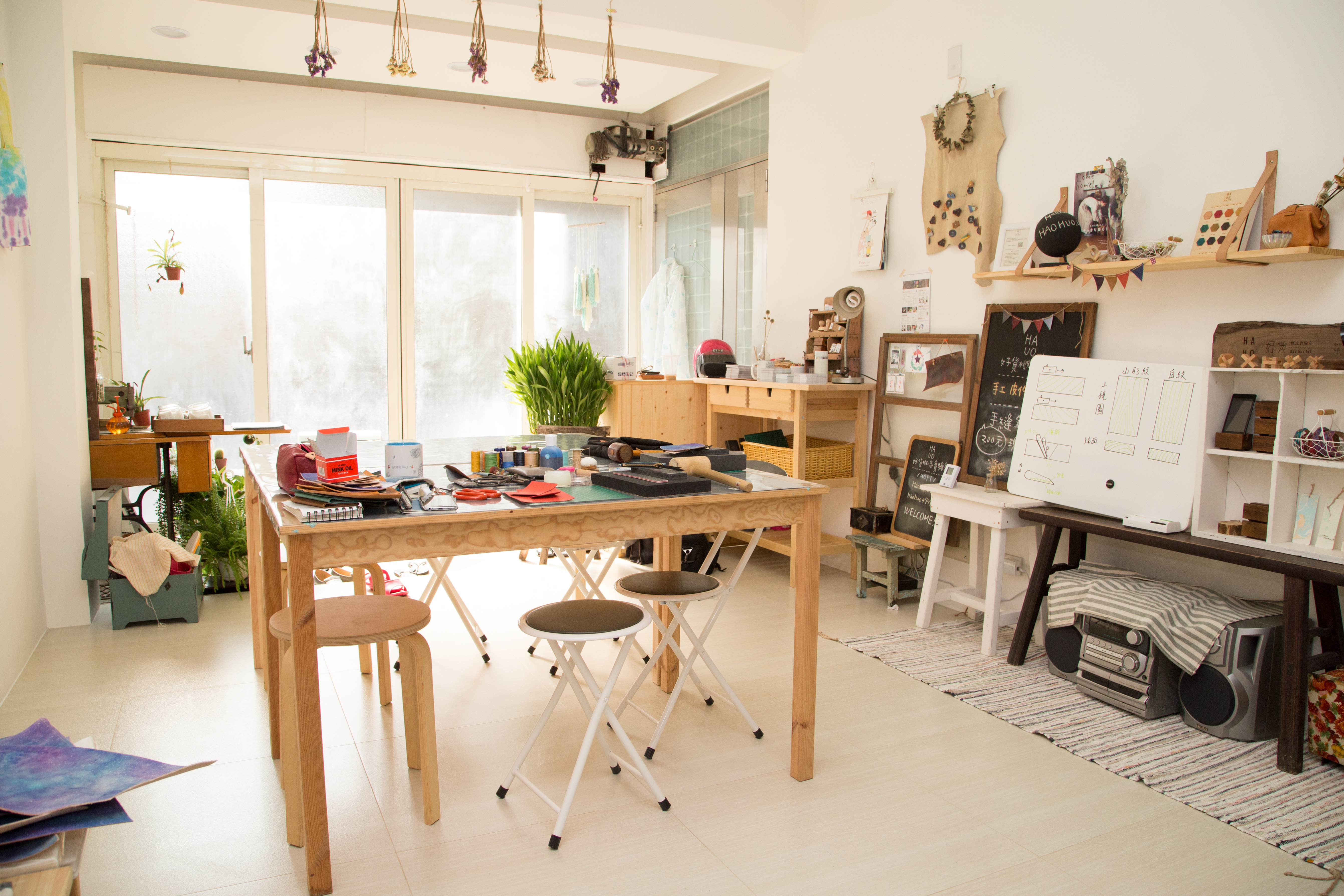 一進入工作坊就可以看見上課時的大木桌,一堂課最多可以容納8人,圍繞著教室周圍布置了溫馨的植栽小物、羊毛氈裝飾、小型畫作等等,是個相當療癒又放鬆的環境。桌椅上隨處可見兩人創作時使用的工具和待完成的皮料,更為這個藝術空間增添創作實感。