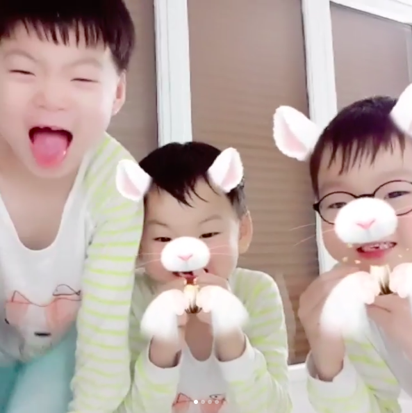 各位阿姨姊姊們一定很想念淘氣的三胞胎吧!3個男生湊在一起總是什麼都玩得很好、覺得很有趣,而大韓民國萬歲不改淘氣本性,只是兔子App特效也可以讓他們玩得意猶未盡~宋一國爸爸大概覺得這3隻兔子實在太萌了,所以放到了個人IG上和大家分享!