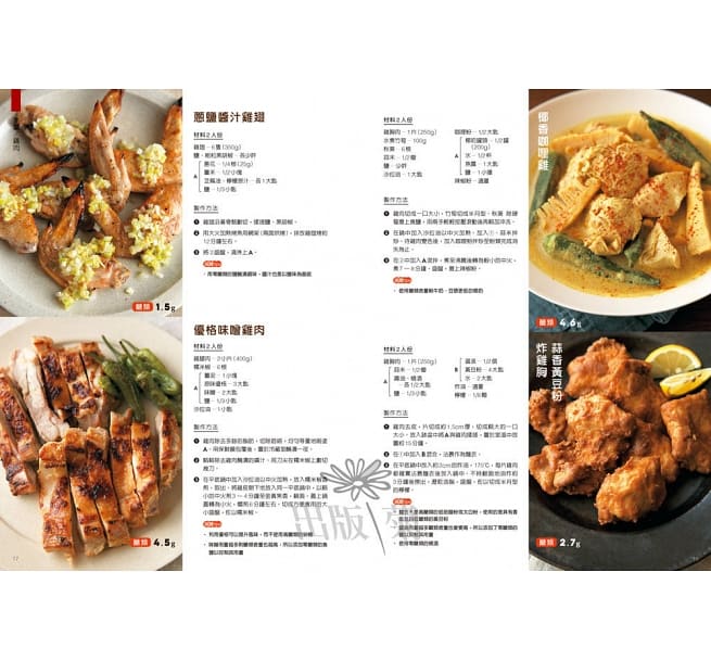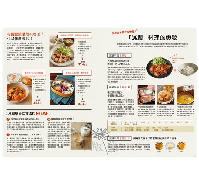 蒜香黃豆粉炸雞胸、香煎豬排佐起司醬汁、蒜香奶油煎牛排、柚子醋醬汁的半烤鰹魚、舒芙蕾蛋卷、蛤蜊日式高湯義大利麵…這些美食從主菜、湯品、配菜到醬汁,通通收錄在大師的佛系減醣食譜中,把握減醣料理的奧秘「1、2、3原則」列出200道食譜,不但分量十足、營養均衡,還能自由組合每一天的三餐,更不會因為吃膩半途而廢。(還貼心附上含醣量表)