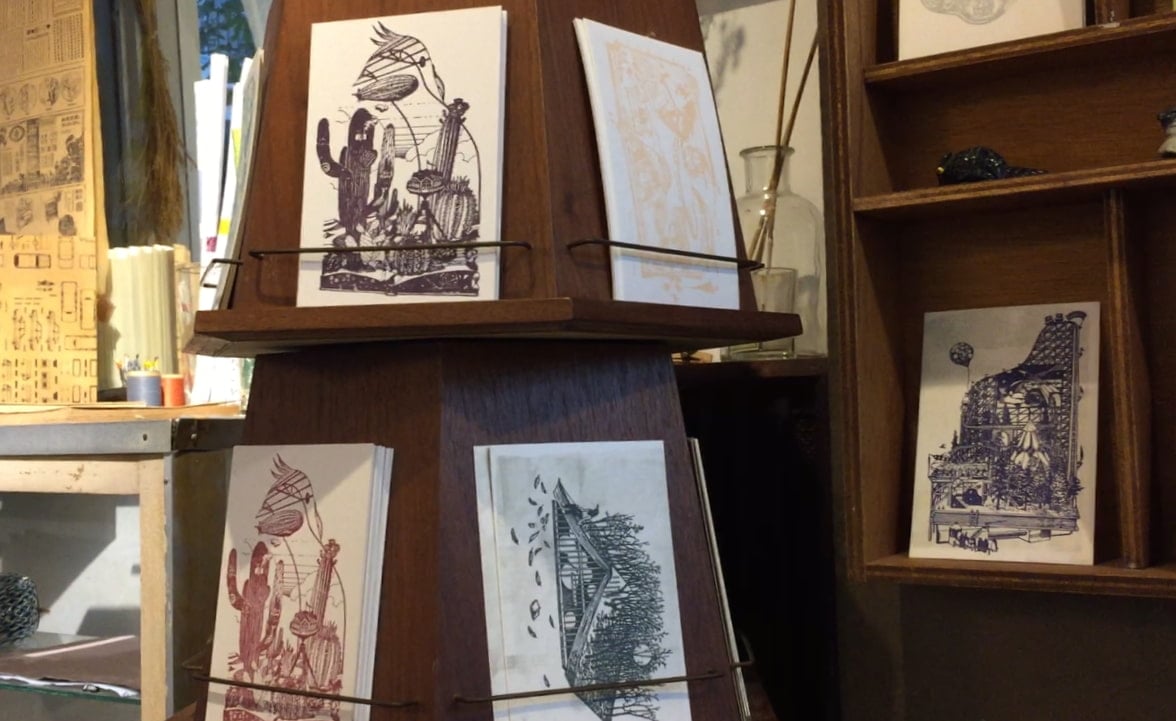324版畫工作房自2004年創辦,實體店面則邁入成立的第九年。店裡放眼望去,所有作品都出自楊忠銘老師之手,他先設計出圖稿、做版,之後再與不同的版畫師傅合作印出。版畫圖樣多變、細膩、複雜,展現出創作者豐富的想像力與生命經驗。也因為每一次印製的油墨量都會有些微不同,當購買明信片時,店員會特地將每一版的印刷成品排放在桌上,讓顧客自行選擇喜歡的版本。