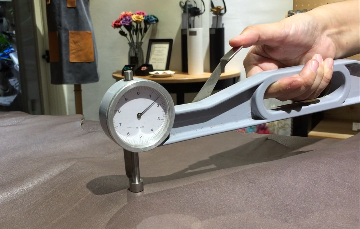 那麼多大小不一的皮料要如何計價呢?老闆娘特別講解到,皮革以「張」售出、不能裁切購買,選定好想買的某一張皮革,再測量皮革的「才」數(1才約等同於30.48*30.48公分),之後乘上每才單價,就是一張皮革的價錢囉!而皮革的價格不只取決於才數,生長在動物身上哪個部位也是重要的影響因素。而且呀,同一張皮革的厚薄度其實是不均等的,能做出的皮件(皮帶、零錢包等等)也不一樣,所以還必須經過照片中的量測儀來判斷測量。