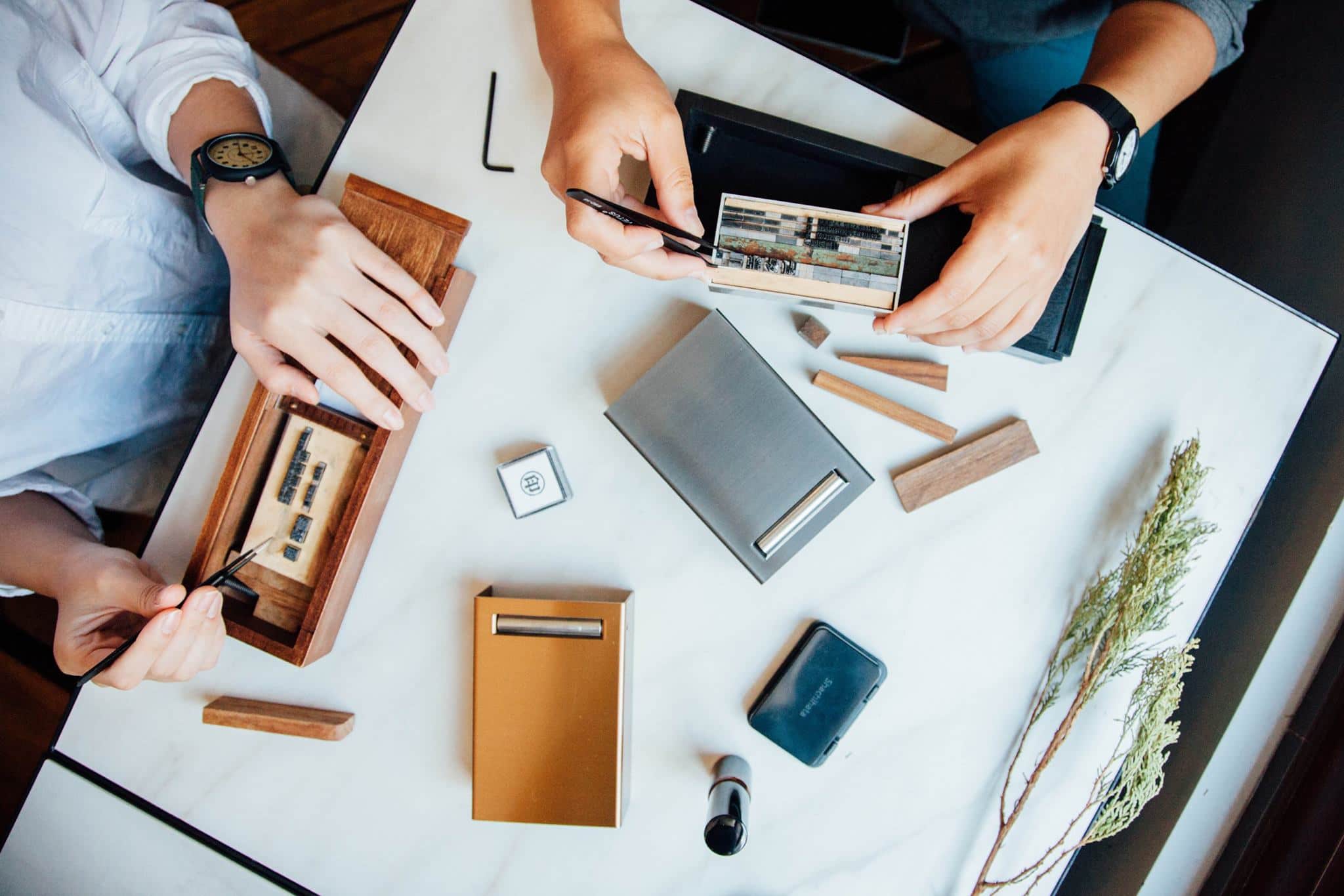 走進一間印刷行的實體店面,映入眼簾是簡潔、灰白調性的室內空間,桌上擺設著他們獨家開發的幾樣文具,包括001號「隨身活版印刷機」、002號「造紙機」、以及剛結束募資的003號「活字印」,而現場同樣有販賣其他周邊耗材,像是名片卡、名片版、塑膠活版字等等。