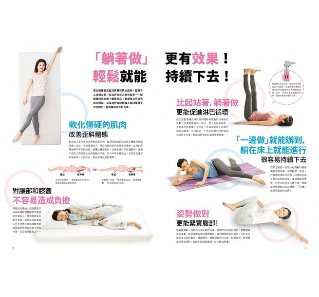 你沒看錯,日本專家們主打的就是這一款「躺著做」的伸展操,藉由各種躺姿伸展操,讓足部及下半身上提,促使血液循環順暢、提升代謝力,不只腰痛、失眠、骨盆歪斜都能改善,美腿、小蠻腰輕鬆「拉出來」!簡單好上手的動作,不會大爆汗或讓你體力不支中途放棄,睡前、追劇時,躺在床上(或地毯上)就能隨時開始,根本是懶人福音啊~(還能變年輕!)