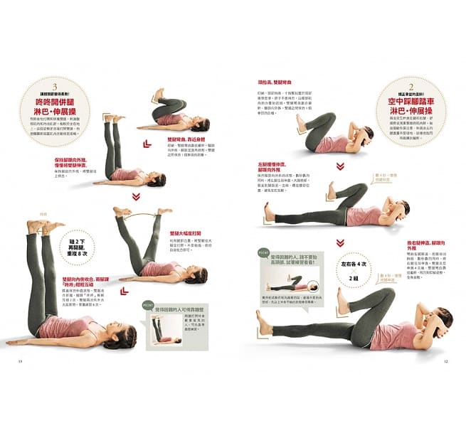 第1階段針對「美腿養成」同時解決駝背、腰痛及骨盆歪斜,列出多種躺姿伸展運動,像是矯正骨盆時,就能採用專家建議的「空中腳踏車」淋巴伸展操,雙手托著頸部、頭抬高,左腳慢慢伸直腳跟向外推,之後再換右腳,左右各4次共做2組即可!