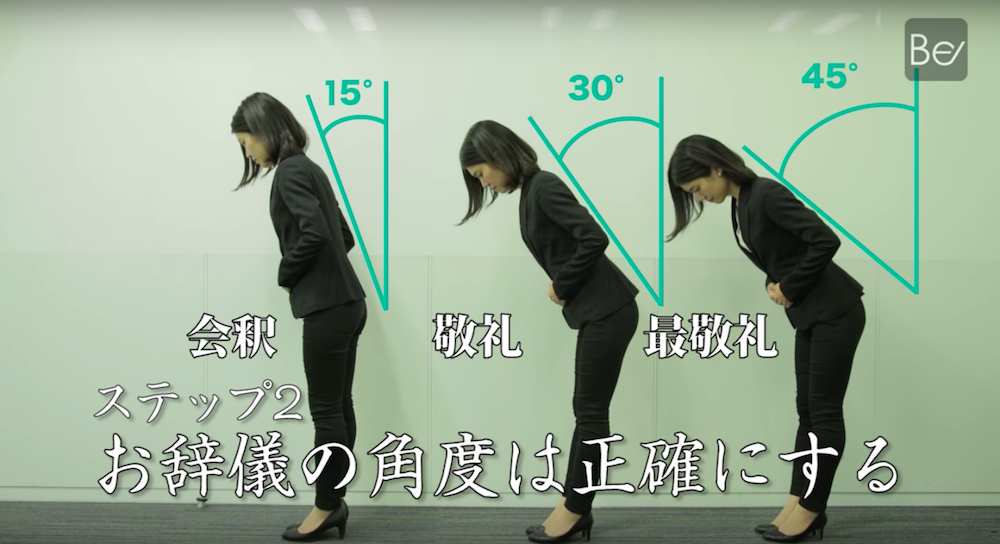如果幾位同事一同前往拜訪客戶,或是任何多人要交換名片的場合務必需要排隊,不能散亂地站著。還有打招呼用的鞠躬為15度角、行禮用為45度角、道歉或是極重要的場合則為90度角。新人訓練的時候就要練鞠躬練到腰痠背痛啊~