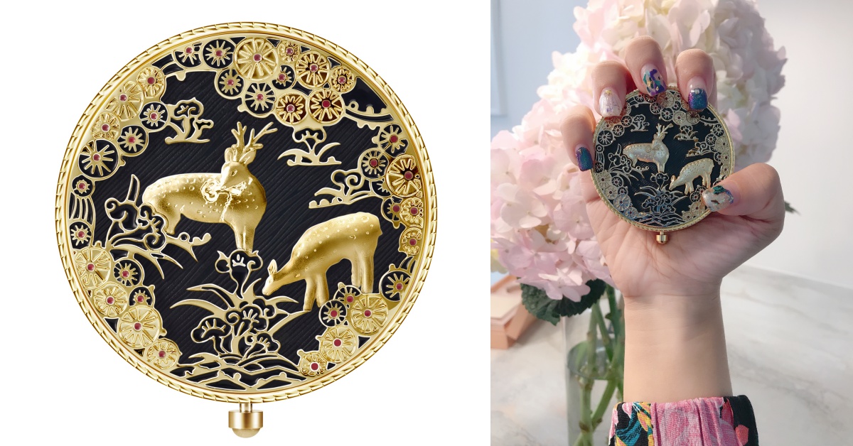 拿在手中極高調!2018限量版花釉香粧盒以金屬入絲工藝,於內斂低調的黑色木紋表面,運用奢華純金絲線雕繪栩栩如生的白鹿、松樹與永生草,盡顯華麗尊貴。打開粉盒還印著錯落有致的永生草雕花壓紋,十分精緻。粉體富含全新「高麗人蔘花精萃」與「梅花精萃」,強化肌膚防禦修護力,有效隔絕外界傷害,結合「聚光亮采粉體科技」及珍珠亮采複合物,為肌膚增添淨透明亮光澤。10/ 25台北新光三越A8館獨家首賣,其他限定貴點11/1上市!