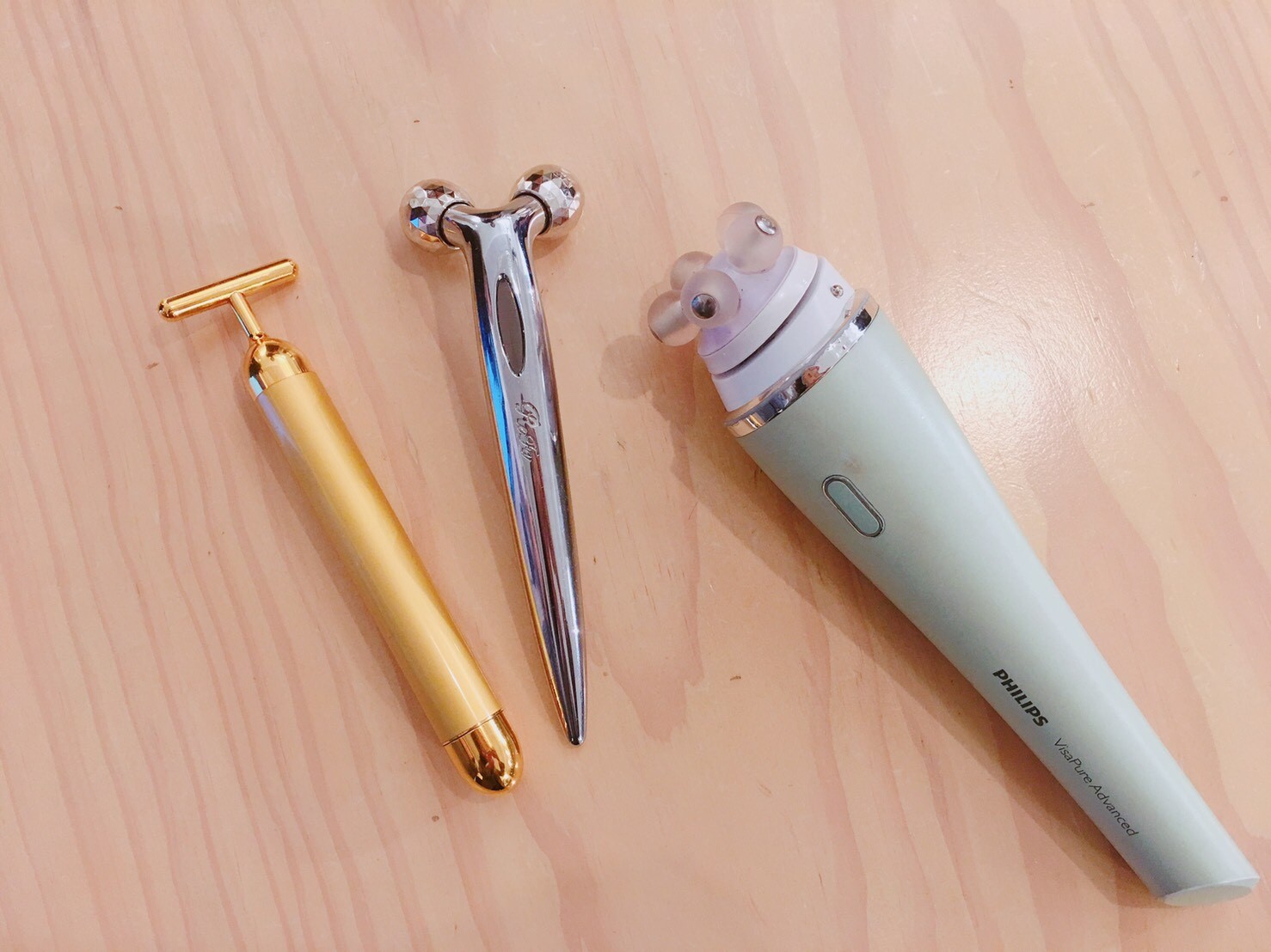 為了幫肌膚拉提、消水腫,妙妙會特別搭配美容儀器使用,由左至右:黃金T自棒、Refa滾輪、PHILIPS淨顏煥采活膚SPA美膚儀,這些都是化妝箱必備的工具,絕對不能少!