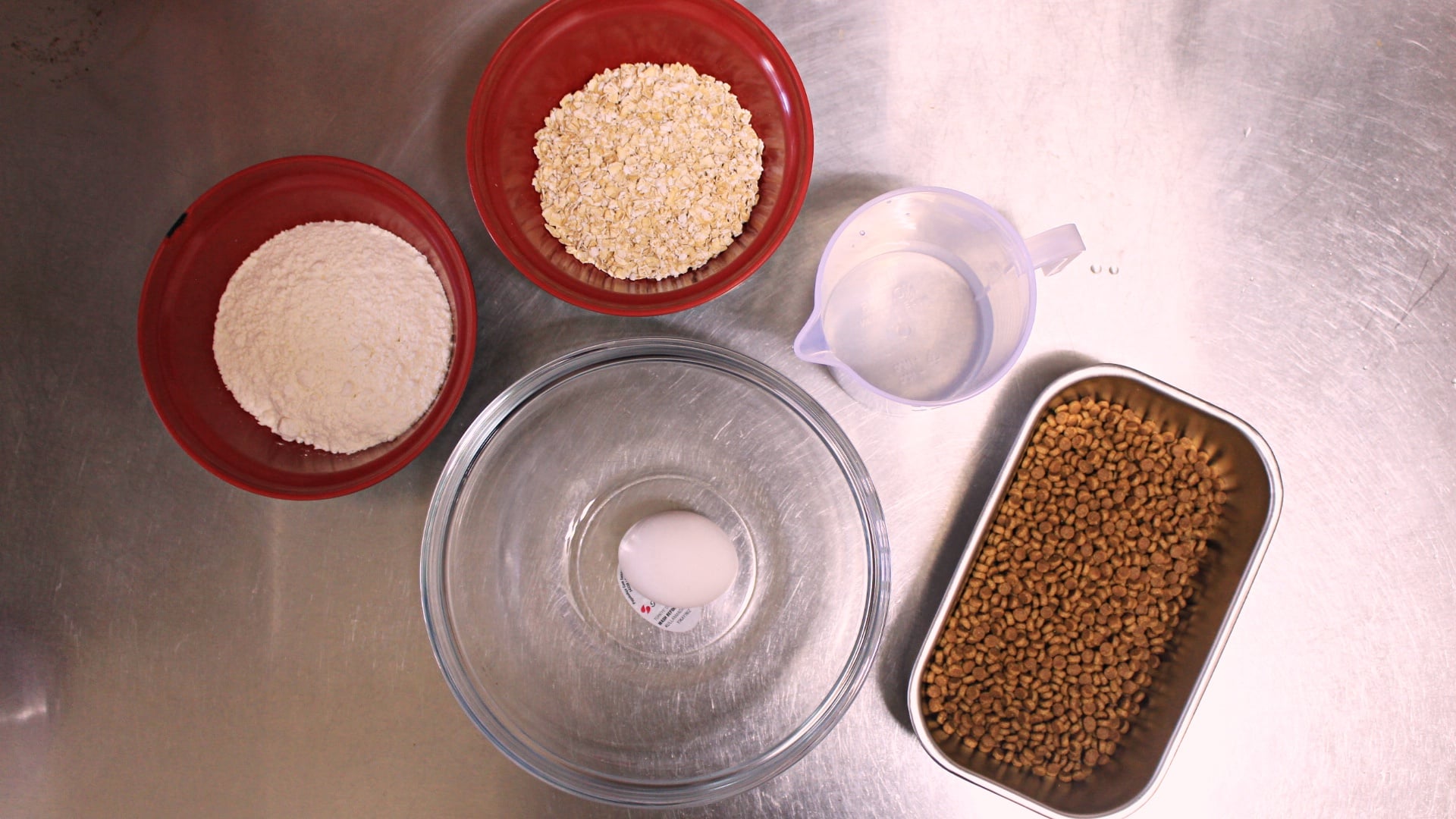 寵物飼料120g(視對象是貓或狗而定)、中筋麵粉170g、大燕麥片60g、開水120cc、雞蛋1顆。