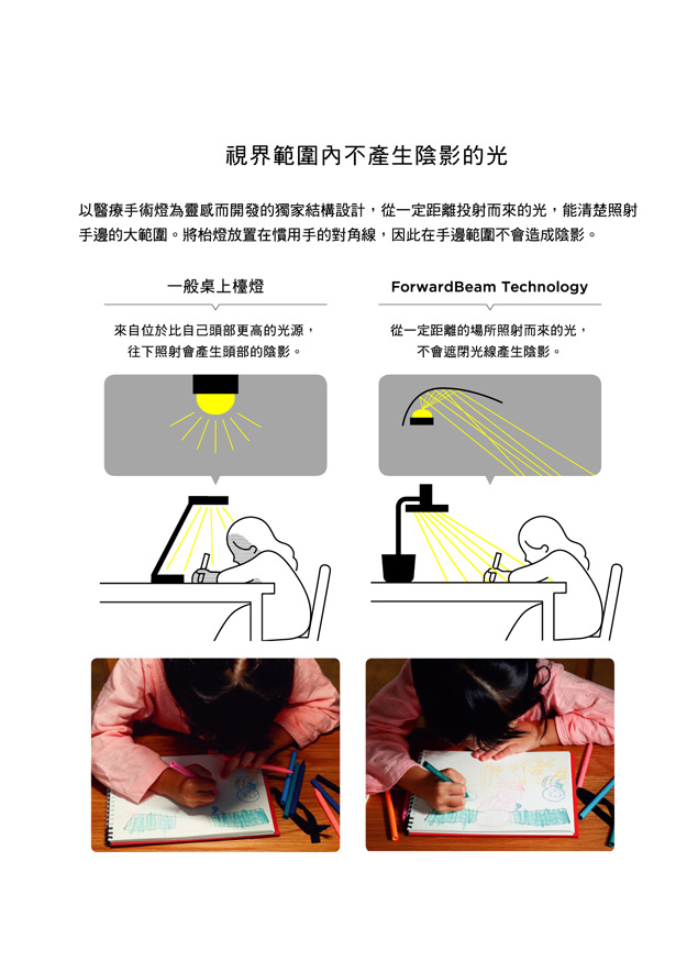 為了開發出大人小孩皆適用的最佳護眼檯燈,BALMUDA以被稱為「無影燈」的醫療手術燈為靈感,獨家與日本手術燈市佔第一的山田醫療照明共同開發ForwardBeam Technology(前向光束技術),利用鏡反射發出不會產生陰影的光,從一定距離投射而來的光,能清楚照亮手邊大範圍,提供絕佳視角。