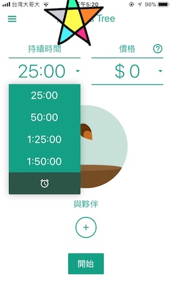 進入《Flora》後,可依照個人的需求選擇專心時間,除了25分鐘、50分鐘等制式時間之外,也可以自行設定時間長度。按下開始鍵之後,一粒小種子就被你種下囉,此時就放下手機去做自己的事情吧!(每一次種下的小樹可能都不一樣,有多款樹等著你來解鎖哦~)
