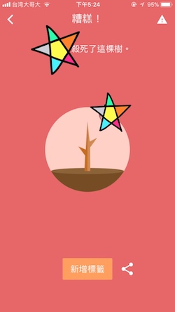 倘若你在種下樹苗之後反悔,選擇按「放棄鈕」結束這一回合的話⋯⋯這棵小樹就會被你殺死,《Flora》的介面也會變成殘酷的紅色,再次提醒你因為克制不了手機的誘惑,變成了一名殺樹者。