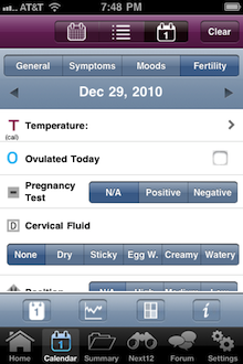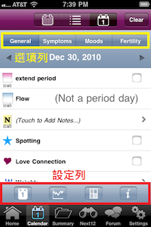 Fertility是懷孕相關的紀錄選項,基礎體溫是一定要記錄的,有助於判斷排卵日期;而ovulated today可以記錄排卵日;另外也可以記錄驗孕結果,真是超貼心的!而Cervical Fluid就是女生的分泌物狀態,(似乎也會隨著生理期而改變);另外還有多項跟孕期相關的生理狀態紀載選項,對於懷孕中的準媽媽來說,是相當實用的一套軟體。