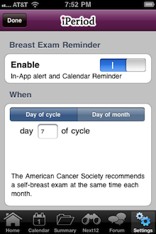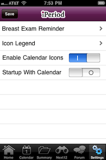 非常貼心的,iperiod有一項乳房檢測提醒功能,使用者可以自行設定每月同一時間進行檢測。而月曆模式底下的圖示,也可以選擇關閉顯示功能,讓畫面看起來更加簡單,個人非常喜歡iperiod這些貼心的選項功能,可以配合使用者喜好,自行調整。