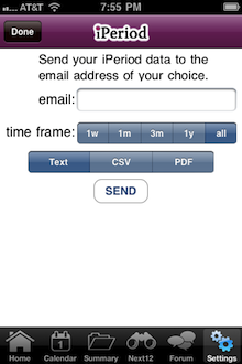 資料備份的選擇有以電子郵件寄送(三種格式),或是利用wifi直接上傳至手邊的電腦,而有建立iperiod帳號的使用者,也可以直接登入帳號進行上傳。