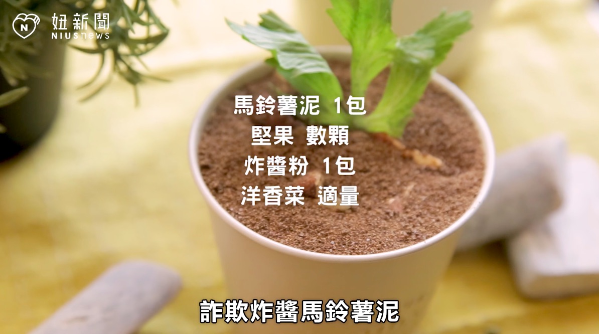 由於泡麵的炸醬粉是遇水就會化成醬的狀態,所以最上層的部分先填入堅果粒,再倒入炸醬粉,避免讓炸醬粉和含水氣的馬鈴薯泥做直接接觸~最後用洋香菜代替薄荷葉的部分插上土壤,小盆栽就完成了!是不是要87分像呢~