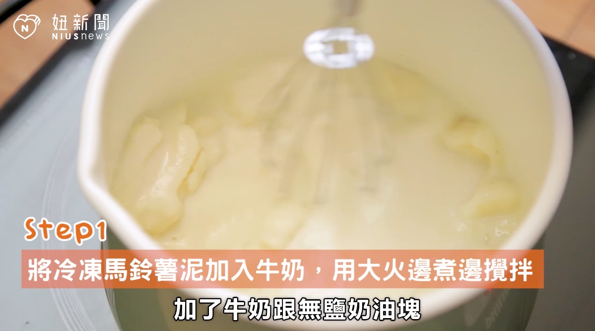 順便告訴大家在煮馬鈴薯泥的小撇步,可以在過程加入牛奶和無鹽奶油來增添香氣,而且記得攪拌過程要先用大火再用小火喔,免得馬鈴薯很快就焦掉~