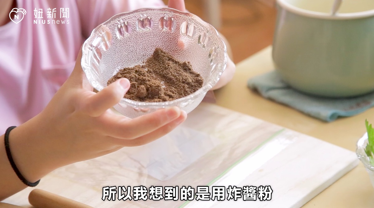 但純粹的炸醬粉又太無聊,想增加一點口感上的變化,所以不NG小姐加入了敲碎後的堅果粒當作土壤裡的土塊部分~敲碎堅果的方式就是把堅果放入夾鏈袋,用桿麵棍敲碎就可以了!