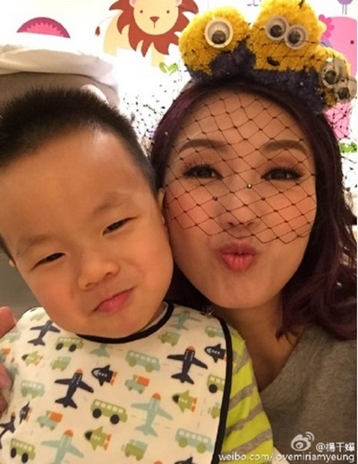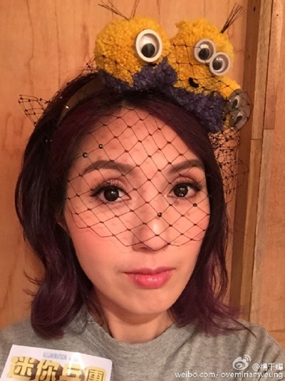楊千嬅抱著愛子在微博分享:「#迷你兵團#大愛這頭飾,第一次為卡通片配音,還演反派,很有意思的一次挑戰#Minions迷你兵團#」