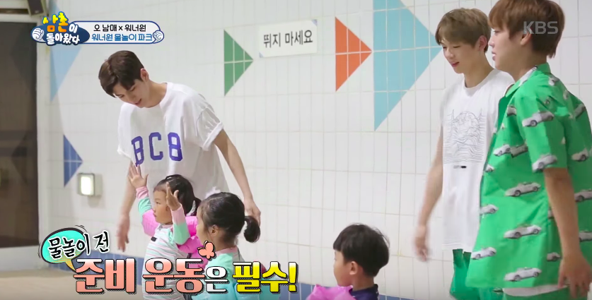 Wanna One先是帶著3姊弟做暖身運動,然後姜丹尼爾、朴志訓、尹智聖、邕聖祐用一些特殊的姿勢入水,這群大男孩真的很會玩耶!
