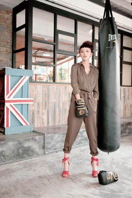 柔軟的V領軍綠襯衫搭配無袖緞面連身褲裝,利用材質的差異作出層次感後再隨性的投入對比色的鮮紅麂皮跟鞋就很有都會感。