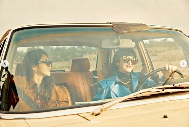 可以看到金惠秀穿著藍色的長版皮風衣,旁邊的韓素希則是一身牛仔勁裝、搭上紅色夾克,氣場全開的造型一看就知道是要去幹大事(笑),拍攝地點還選在荒涼的岩石荒郊,還有幾張是開著豪華跑車的畫面,兩人戴上墨鏡兜風中,驚喜合影照一釋出馬上勾起網友的好奇心,紛紛留言大呼:「兩大女神居然遇上了!」「是新作品合作嗎?」韓素希也跑去金惠秀的IG留下「一串愛心」,期待謎底揭曉!