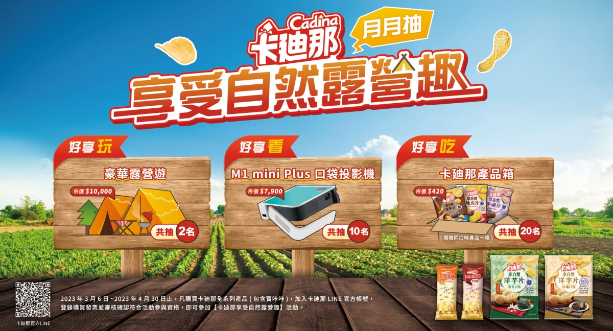 同時即日起-4/30期間,卡廸那舉辦【卡廸那 享受自然露營趣】促銷活動,只要購買卡廸那全系列產品,加入卡廸那LINE官方帳號,登錄發票即可參加,月月抽出萬元輕奢華露營體驗!