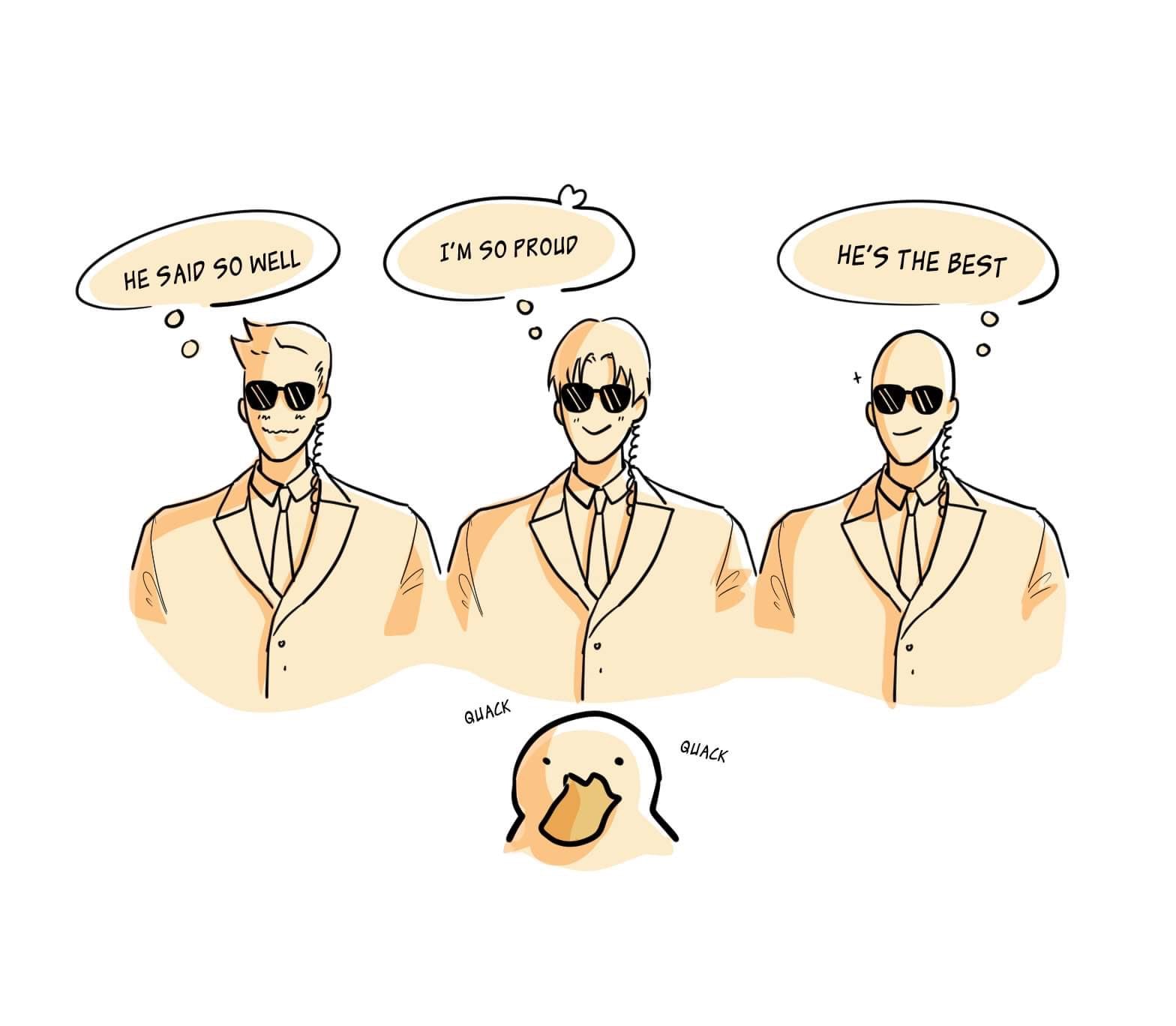 黑幫生活看似很無情,但組織內的眾人對鴨鴨教父都相當有愛,雖然鴨老大只會「呱呱」叫,但小弟們卻總是一副吾家有子初長成的欣慰模樣,內心還想著老大叫得好叫得妙(?),而在面對老大萬年不變的鴨臉時,還能從鴨臉上看出其實老大現在正在不爽,手足無措地想安撫牠... 你們確定這隻鴨鴨是老大,不是你們的兒子嗎?(笑)