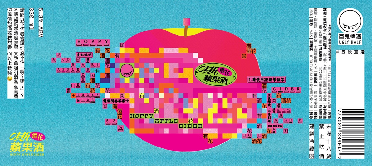 酉鬼啤酒的「嘶~酒花蘋果酒」突破了大眾對蘋果酒過於甜膩的既定印象,透過冷泡啤酒花的釀造手法,帶來飽滿香氣和層次豐富的口感。在重新設計酒標時,酉鬼啤酒特別將「冷泡啤酒花的熟成過程」視為蛻變的象徵,並以「馬賽克」和「答案卡」圖案作為象徵符號,將酒標設計成貼紙,增加與消費者的互動,當撕開馬賽克,仿佛在揭開新章,探索全新風味。酒標設計還融合了答案卡的元素,意味著成長與轉變;酒標上的風味描述則以選擇題的形式呈現,這一系列的設計巧思呼應了「嘶~酒花蘋果酒」想傳達蛻變的核心概念。
