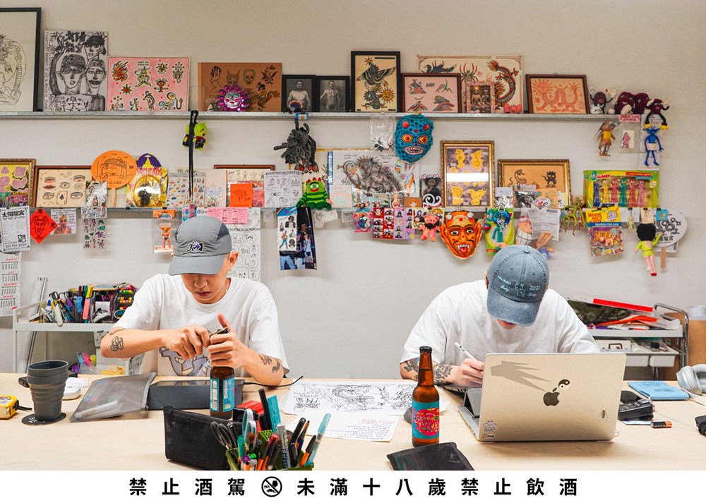 Sic(左)與York(右)為太陽龍宮主視覺擔當,共同為酉鬼啤酒「嘶~酒花蘋果酒」酒標創作。