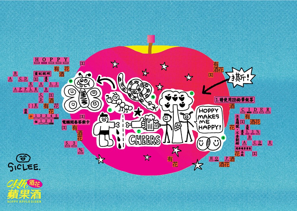 Sic擅長將生活中的日常故事重新詮釋,作品以簡潔的線條和幽默透過刺青的形式表達。在這次的酒標設計中,Sic以蘋果與啤酒花的元素為主題,創作了富有寓意的畫面:從毛毛蟲吃蘋果變成蝴蝶,到夏娃認為啤酒花讓她更快樂,亞當則為了乾杯不惜斷手,這些角色生動地傳遞出蛻變與酒花蘋果酒令人快樂的故事。