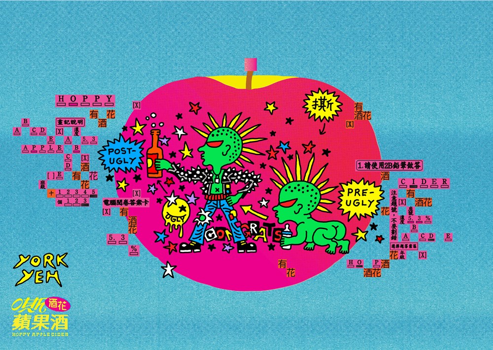 York則擅長將美式刺青風格與台灣元素結合,他的作品色彩鮮豔,線條強烈。在這次的設計中,York描繪了一個從喝牛奶的Punk Baby蛻變為穿著華麗服裝、手捧啤酒的龐克巨星,巧妙詮釋了「嘶~酒花蘋果酒」帶來的蛻變。