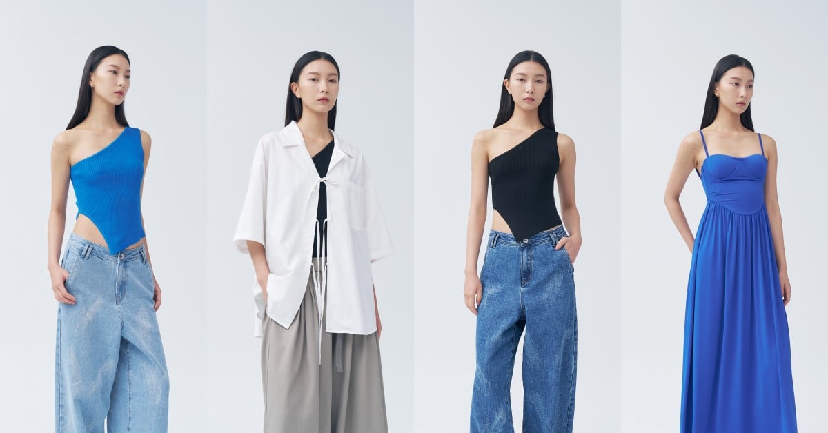左至右 LAB+JWH 不對稱斜肩背心 NT$1,280;LAB+JWH 綁帶中性短袖襯衫 NT$ 1,880;LAB+JWH 中性丹寧長褲 NT$ 2,480;LAB+JWH挖背洋裝 NT$ 2,580