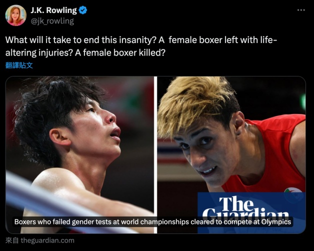 在巴黎奧運舉辦期間,有《哈利波特》系列作品代表作的J·K·羅琳,7月30日轉發一則《衛報》的「性別質疑」新聞,上面出現台灣拳擊女子選手「林郁婷」和阿爾及利亞選手「哈利夫(Imane Khelif)」,去年因為遭到國際拳擊協會指出具有「男性XY染色體」而撤銷資格,羅琳發文表示「如何才能結束這種瘋狂? 要等到女拳擊手受到重傷? 又或者另一個女拳擊手被打死?」