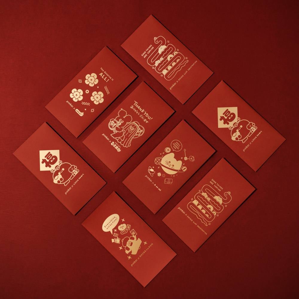 Pinkoi 在今年特別攜手6位台日人氣插畫家,胡子碰碰、小心臟、蜜可魯、A ee mi、瑞秋廖、ひま太郎,推出聯名閃亮燙金紅包。採用高雅沉穩的葡酒紅,搭配帶有橘調的霧金燙印,柔和地襯托出插畫的細緻與魅力,成為大家過年團聚時的暖心驚喜。