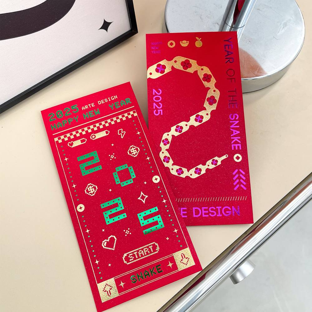 由 ARTE Design 獻上的蛇年質感雙燙金紅包,除了超有質感的紅包材質,融合復古 8 bit 元素的圖案設計,也讓人眼睛為之一亮。俏皮又可愛的紅包袋,彷彿一秒進到遊戲世界。快按下 START 展開新的一年吧!