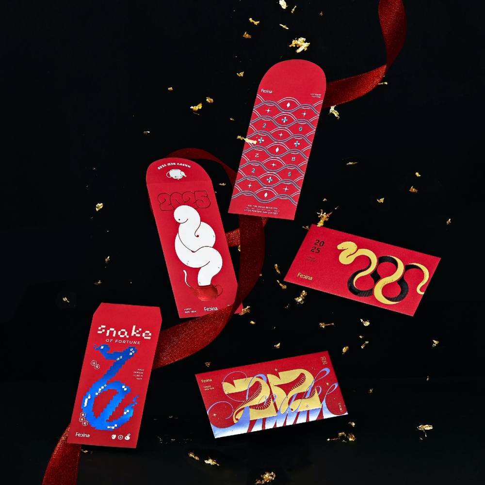 Fecina 的蛇年紅包組合,總共包含了5款厚磅燙金紅包。每一個紅包袋上都能撇見特殊的蛇年元素,命名也採用了與蛇相關的諧音祝福,像是好蛇成雙、蛇來運轉、波光蛇鱗等。相信收到這款紅包袋的親朋好友,也會被這獨特的視覺設計給驚艷。