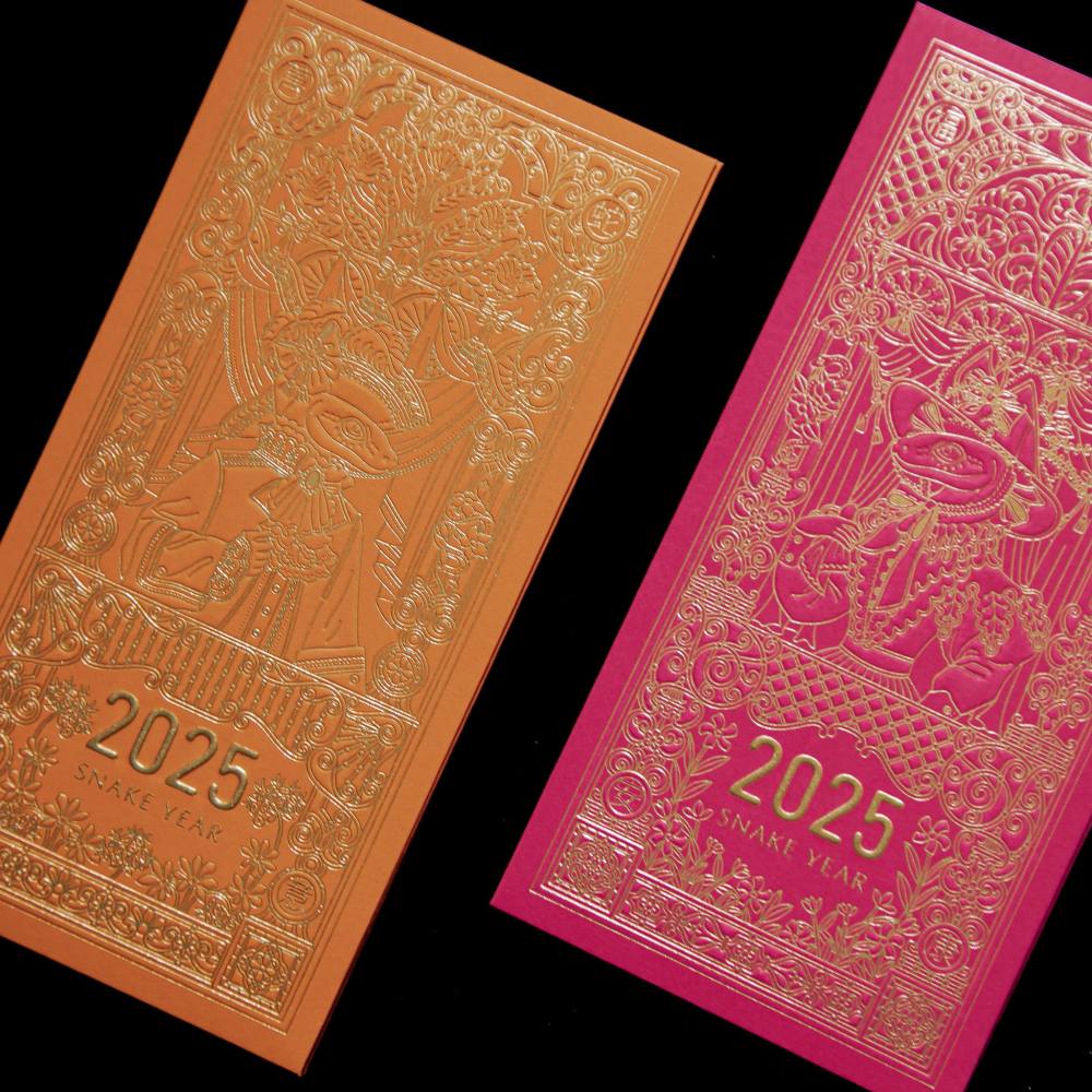 今年 Million ways 推出了兩種限量異色款3入組的紅包,選擇愛馬仕橘及海棠紅來呈現,並維持往年的傳統,在燙印後將內側實心塊打凸。不光宮殿線條比往年更加細膩,為配合蛇的特色也運用了更多的新藝術曲線植物元素。