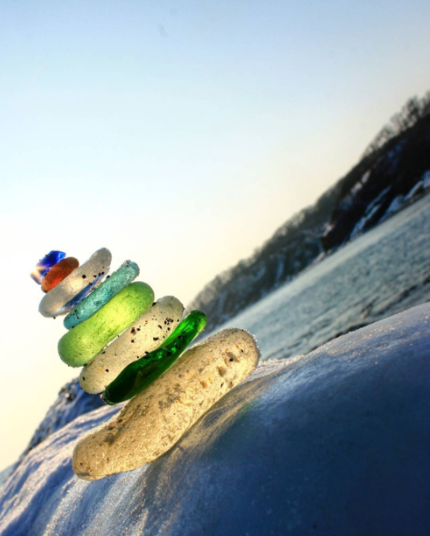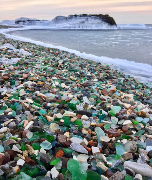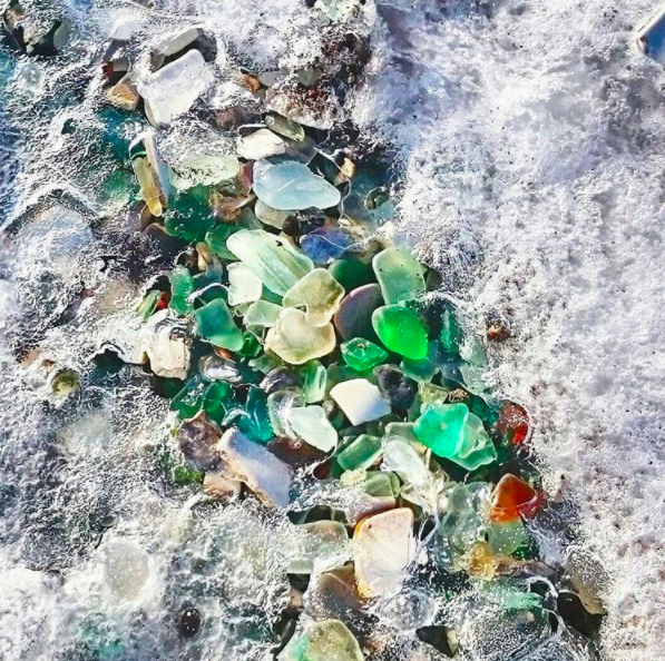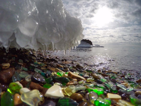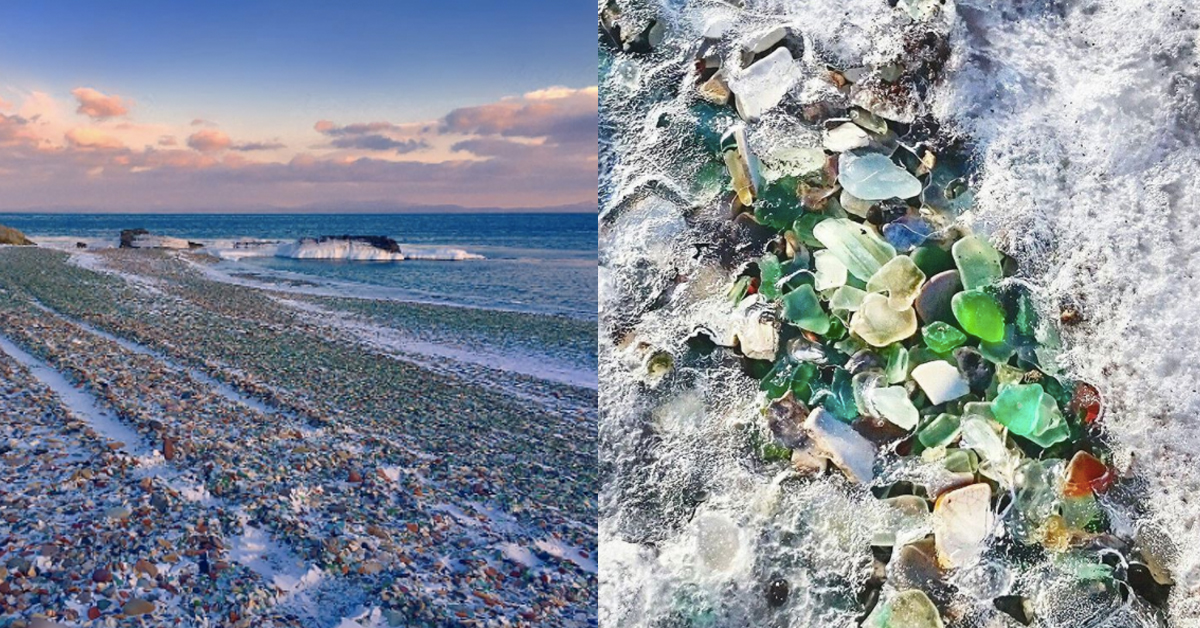 在俄羅斯境內,有一個絕美的海灘祕境。夏天在陽光照耀之下,散射出繽紛的五彩光芒;到了冬天,白雪紛飛之中,則像是地面藏了一整片的彩色寶石,彷彿走入夢幻仙境。