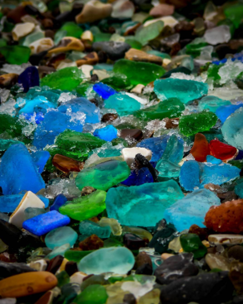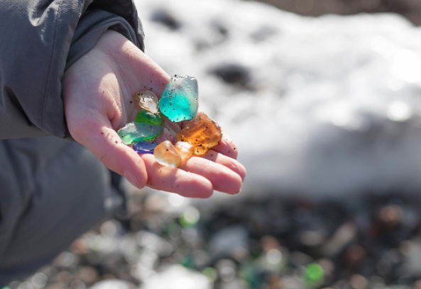 不過,大自然的力量就是這麼神奇,雖然人類無情地把廢棄物丟在海灘上,但經過數十年浪潮不斷地來來回回,把這些玻璃酒瓶捲走,由海洋的強大力量把它們磨得渾圓,變成一顆顆像彩色寶石的玻璃石頭後,重新被帶回這片海灘。
