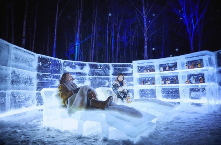 在冰之露天浴場暖好身子後,可以到今年新登場的「冰之休憩空間」享受威士忌。這裡設有用冰塊製成的躺椅及威士忌酒櫃,備齊了20種類的日本威士忌。備有專用的溫暖居家服和高酒精濃度的的威士忌,打造出身體不會感到寒冷卻又能同時享受冰之世界的空間。可以選擇品嚐喜歡的威士忌。