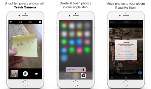 你也是記不住統編或是生活小事,常常都透過照片隨手紀錄的人嗎?相信你一定也曾經為這些用完就沒用的照片佔滿空間而困擾吧!這款App《Trash Camera Pro》主打的就是不會把照片存入相簿,而是放入App的暫存圖庫,當你不需要的時候,只要一鍵刪除就可以,當然~也可以把想要永久留存的照片移進手機的相簿喔!